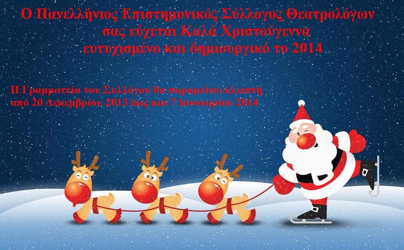 Σας ενημερώνουμε ότι η Γραμματεία του Πανελληνίου Επιστημονικού Συλλόγου Θεατρολόγων θα παραμείνει κλειστή από 20 Δεκεμβρίου 2013 έως και 7 Ιανουαρίου 2014.
