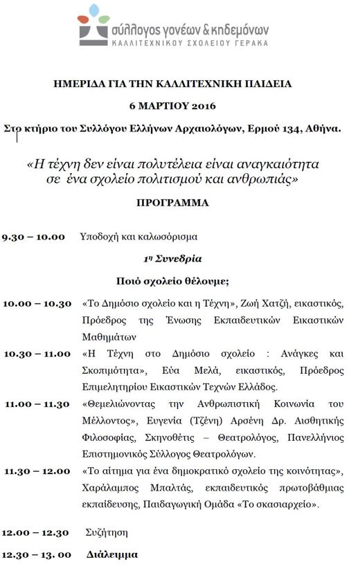 Ο Πανελλήνιος Επιστημονικός Σύλλογος Θεατρολόγων συμμετέχει στην ημερίδα που διοργανώνει ο Σύλλογος Γονέων και Κηδεμόνων του Καλλιτεχνικού Σχολείου Γέρακα, με τίτλο «Η Τέχνη δεν είναι πολυτέλεια αλλά αναγκαιότητα σε ένα σχολείο πολιτισμού και ανθρωπιάς» την Κυριακή 6 Μαρτίου 2016 στο κτήριο του Συλλόγου Ελλήνων Αρχαιολόγων, Ερμού 134.