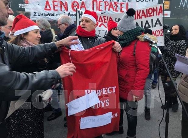 Το «υλικό» προσφέρεται για σκηνή από το θέατρο του Παραλόγου, θα πείτε; Αν μη τί άλλο μάς ενέπνευσε για το δρώμενο, που παρουσιάσαμε παράλληλα με τη σημερινή μας διαμαρτυρία: Ο Άη Βασίλης με τους βοηθούς του βγάζει από τον σάκο του και μοιράζει διοριστήρια, μεταπτυχιακά, δεύτερα πτυχία και διδακτορικά, ακόμα και παιδιά –και 1 και 2 και 3! Κάποιοι σπεύδουν να τα αγοράσουν, αλλά ο Άη Βασίλης μας είναι γενναιόδωρος, τα σκορπάει!…
