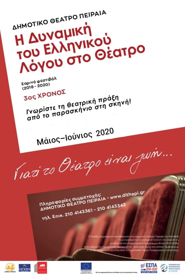Σας επισυνάπτουμε το αναλυτικό δελτίο τύπου του εκπαιδευτικού προγράμματος με τίτλο «Η Δυναμική του Ελληνικού Λόγου στο Θέατρο» 2020 με το χρονοδιάγραμμα προβολής των ανοιχτών προβών και παραστάσεων, το οποίο θα πραγματοποιηθεί μέσω διαδικτύου με την μορφή επεισοδίων από την κεντρική ιστοσελίδα του Δημοτικού Θεάτρου Πειραιά στο Φεστιβάλ Δυναμικής.