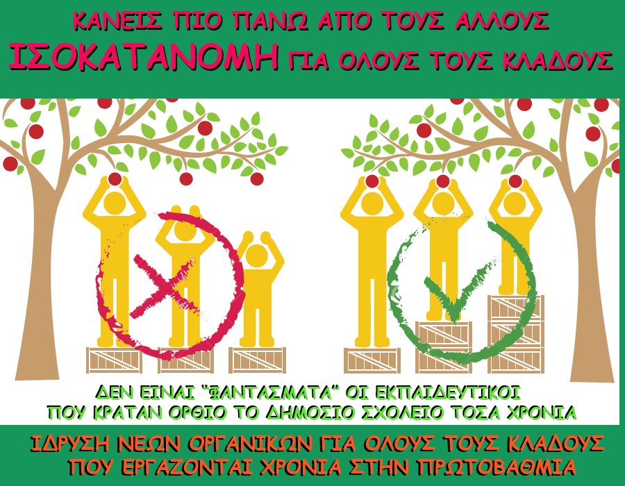 Ζητάμε το λογικό. Το αυτονόητο. Το δίκαιο: Δημιουργία οργανικών θέσεων για τους κλάδους που τις στερούνται και δίκαιη κατανομή για όλους. Ζητάμε μόνιμους διορισμούς ανάλογους με τις ανάγκες της εκπαίδευσης. Διορισμούς ανάλογους με τις προσλήψεις αναπληρωτών που γίνονται εδώ και τόσα χρόνια, καλύπτοντας πάγιες ανάγκες και αποτελούν το μόνο αντικειμενικό κριτήριο. Τίποτα λιγότερο δεν θα είναι αρκετό, ούτε για μας αλλά ούτε και για τους μαθητές μας.