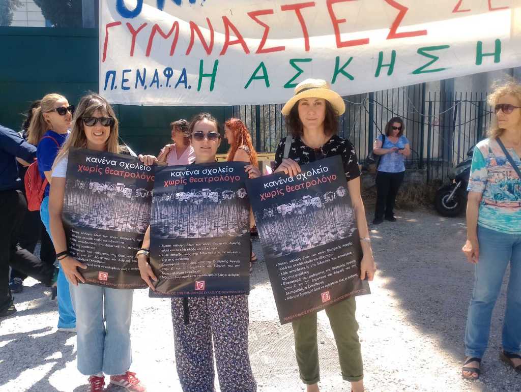 Κοινή παράσταση διαμαρτυρίας πραγματοποιήθηκε την Πέμπτη 23 Μαΐου στο Υ.ΠΑΙ.Θ.Α., με παρουσία των μελών του Πανελλήνιου Επιστημονικού Συλλόγου Θεατρολόγων (Π.Ε.ΣΥ.Θ.), της Πανελλήνιας Ένωσης Αναπληρωτών Φυσικής Αγωγής (Π.ΕΝ.Α.Φ.Α.) και της Ένωσης Εκπαιδευτικών Εικαστικών Μαθημάτων (ΕΝ.ΕΚ.Ε.Μ.). Ως συνάδελφοι/ισσες εκπαιδευτικοί με κοινό όραμα και αγώνα συγκεντρωθήκαμε ώστε να διεκδικήσουμε τη σύσταση νέων οργανικών θέσεων και μαζικούς διορισμούς, για την κάλυψη όλων των κενών στα σχολεία! Για να πάψει η ομηρία και η περιπλάνηση εκατοντάδων συναδέλφων /φισσών μας και η υποβάθμιση της εκπαίδευσης των μαθητών /μαθητριών μας.