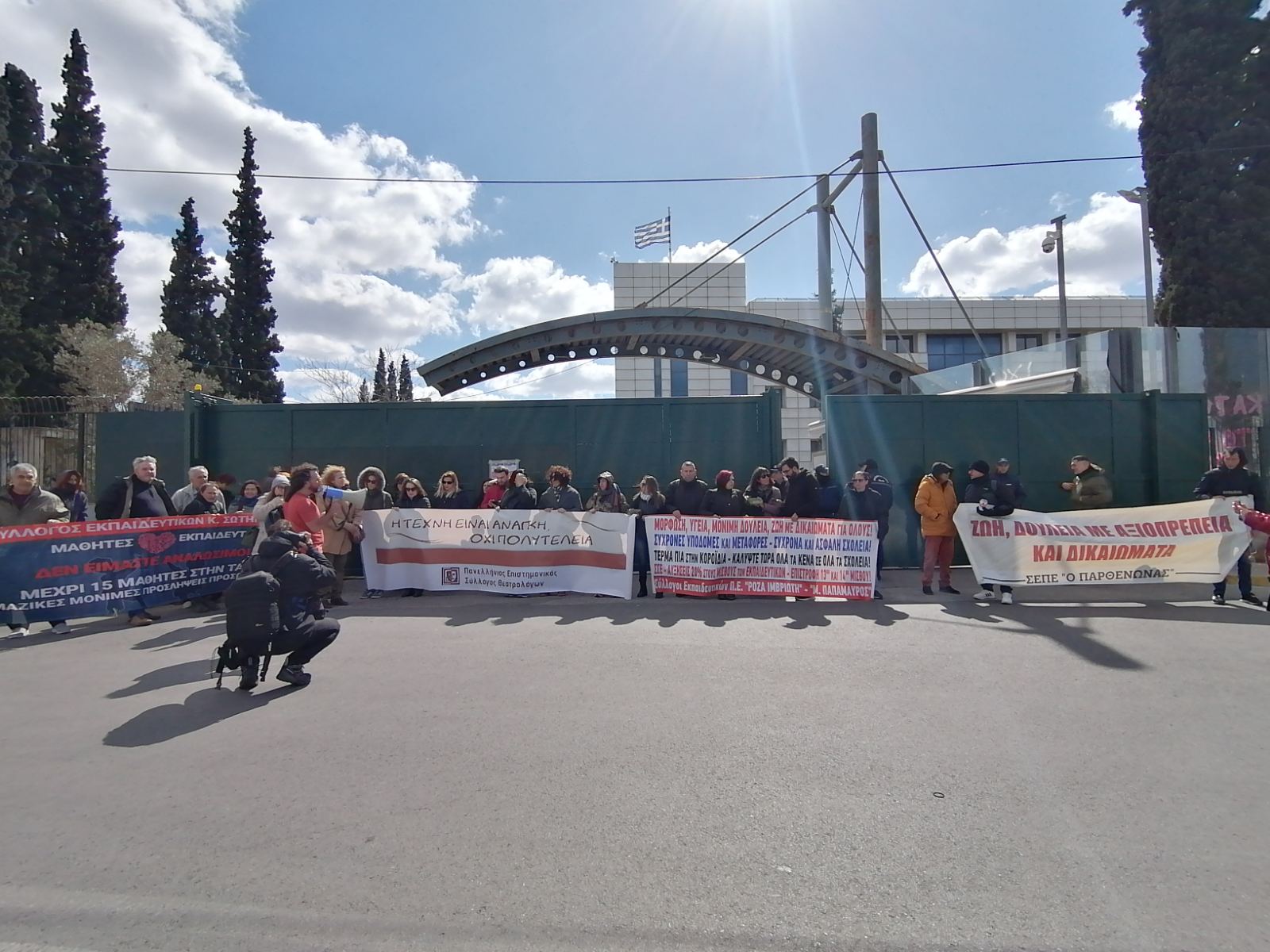 Κοινή κινητοποίηση των κλάδων αισθητικής αγωγής (θέατρο, εικαστικά, μουσική) πραγματοποιήθηκε την Τετάρτη 19 Μαρτίου 2025 στο Υ.ΠΑΙ.Θ.Α, παρουσία μελών του Πανελλήνιου Επιστημονικού Συλλόγου Θεατρολόγων (Π.Ε.ΣΥ.Θ.), του Πανελλήνιου Συλλόγου Εκπαιδευτικών Μουσικής Επιστήμης (ΠΑ.Σ.Ε.Μ.Ε) και του Επιμελητηρίου Εικαστικών Τεχνών Ελλάδος (Ε.Ε.Τ.Ε), καθώς και της ΔΟΕ, πλήθους εκπροσώπων ΣΕΠΕ, ΕΛΜΕ, αλλά και άλλων φορέων (βλ. κάτωθι) που μας συμπαραστάθηκαν. Από κοινού διεκδικήσαμε την ουσιαστική αναβάθμιση της αισθητικής αγωγής σε πρωτοβάθμια και δευτεροβάθμια εκπαίδευση, για ένα σχολείο ελεύθερο, που θα μορφώνει ολόπλευρα και η αισθητική αγωγή θα χρησιμοποιείται μαζί με τις άλλες επιστήμες για να κατανοηθεί η κίνηση της κοινωνίας και μ’ αυτό η δυνατότητα κοινωνικής αλλαγής. Παράλληλα, απαντήσαμε ενωμένα απέναντι στις διώξεις, πειθαρχικές κλήσεις, απειλές, παύσεις εργασίας, απολύσεις κλπ. και γενικότερα στην καταστολή που βιώνουν συνάδελφοι/ισσες μέσα και έξω από το σχολείο, όπως και ενάντια στα σχολεία πολλών ταχυτήτων, στο βάθεμα της κατηγοριοποίησης και των ταξικών φραγμών που φέρνουν τα «Ωνάσεια Σχολεία».